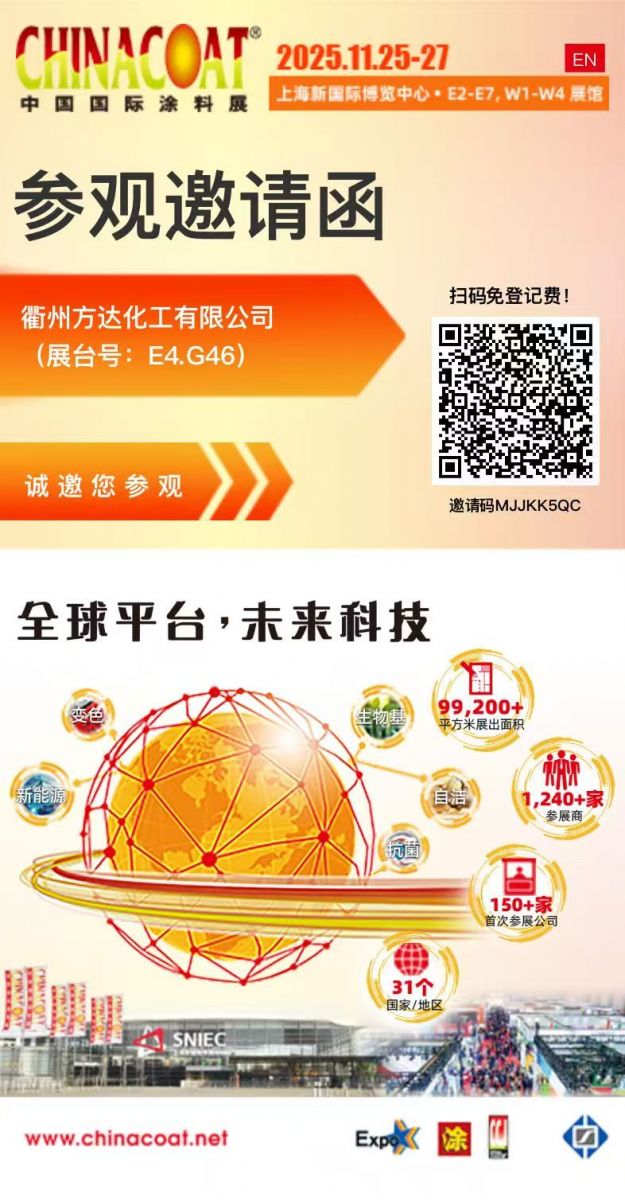 當(dāng)“碳達(dá)峰、碳中和”成為全球涂料行業(yè)的共同命題,一場(chǎng)關(guān)于綠色原料的“革命”正在悄然發(fā)生——衢州方達(dá)化工有限公司率先交出高分答卷!2025年11月25-27日,上海新國(guó)際博覽中心(SNIEC),方達(dá)化工將攜“專注新材料領(lǐng)域,用綠色原料編織低碳未來”的硬核實(shí)力,震撼亮相中國(guó)國(guó)際涂料展(CHINACOAT 2025)E4.G46展臺(tái)。
